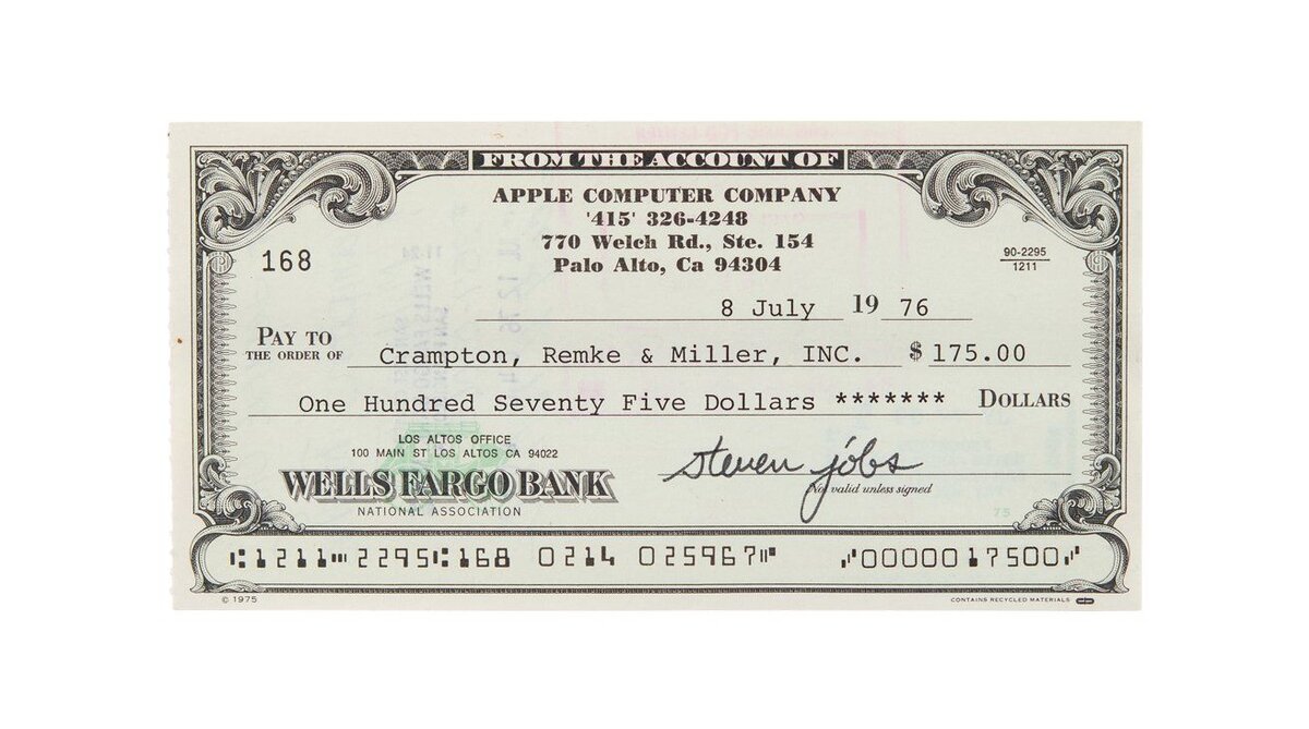 Подписанный Стивом Джобсом чек в 1976 году выставили на аукцион
