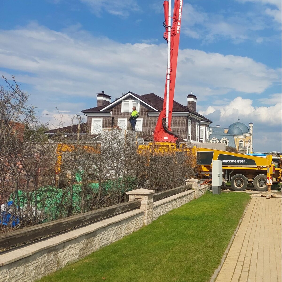 Мы продолжаем строительство двухэтажного дома в стиле французской неоклассики. На днях здесь закончили бетонирование монолитного перекрытия гаража и перемычек 1-го этажа основного дома. Раствор М350 завода «Инком-Бетон» подавали с помощью автобетононасоса Putzmeister с вылетом стрелы до 52 метров. После бетонирования рабочие накрыли опалубку строительной пленкой, чтобы защитить свежезалитый раствор от атмосферных осадков и предотвратить слишком быстрое испарение влаги.