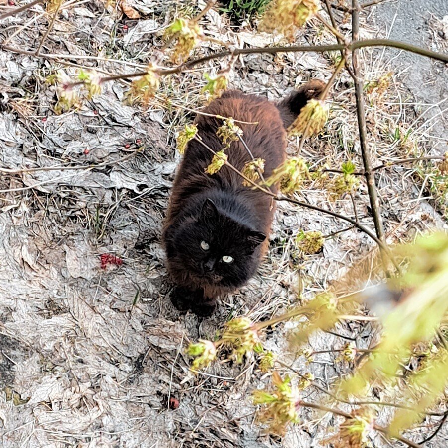 Однажды, солнечным весенним утром Бусик спрыгнул с лоджии, чтобы отправиться на длительную прогулку по окрестностям. Посмотрел наверх, убедился, что я его провожаю взглядом. И тут подошел помоечный кот. Я этого кота давно приметила (и он меня тоже): сибирский длинношерстный кот каштанового окраса. Он умел выживать: добывал себе еду у помойки, в стайках для хозяйских свиней, подачки сердобольных жителей, пережил не одну суровую уральскую зиму. Кот спокойно и внимательно взглянул мне в глаза, уставился на Бусю. А Буся... вполоборота относительно пришельца, немного отвернувшись, предупреждающе грозно зашипел, зарычал, и… перешел на противоположную сторону дороги. Не пожелал связываться с котом? Или достаточной силы в себе не чуял еще: котяра сибирский всех молодых котиков в округе гонял и Бусю моего в том числе. Мне не раз приходилось снимать его с яблони, куда бродяга его загонял. Но на сей раз кот повел себя мирно, не ожидал видно, что мой спокойный и сдержанный котик угрожать ему будет
