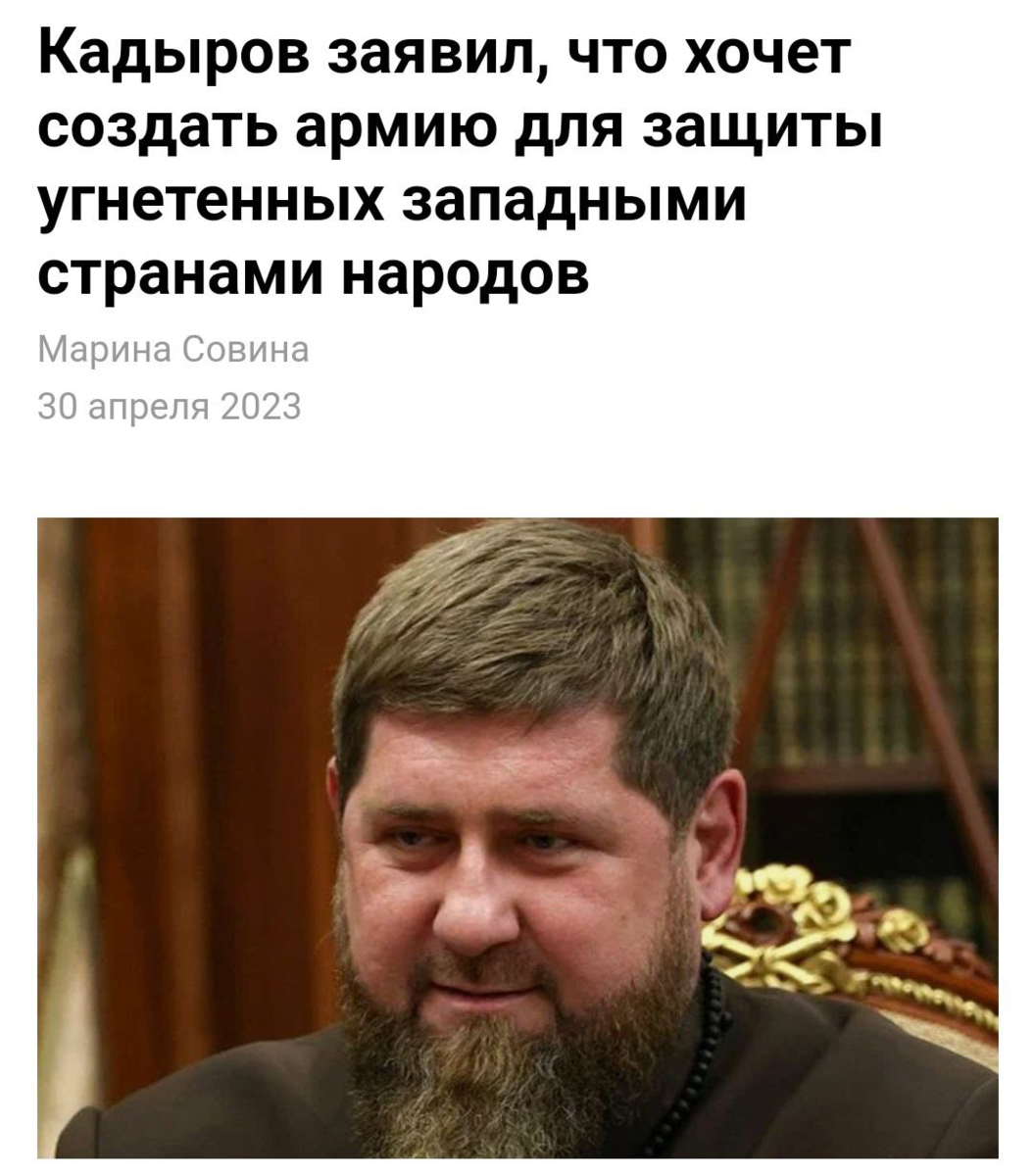 Давно пора. Сколько можно угнетать народы, скажите мне? И ведь никто, кроме Кадырова, не озаботился их проблемами. Вечно нам больше всех надо... Но мне кажется, Рамзану будет тяжело - слишком много таких народов. Кого они не угнетали, скажите мне? Вот именно. Мне кажется, он просто романтик. Как Кампанелла с его "Городом Солнца". Вот смотришь на него и понимаешь - он, конечно, в пылу дискуссии может стукнуть оппонента по макушке кастетом, но, как в том анекдоте, на изделии обязательно будет выгравировано сердечко! «В последнее время я больше думаю, чтобы создать хорошую такую армию, чтобы могли перебраться в разные государства и защищать народы, которые ущемляют те страны, которые называют себя самыми демократичными», — сказал Кадыров. Вот молодец, между прочим. Он мужик серьезный, обычно что говорит, то и делает. Так что у демократических стран в самом скором времени могут начаться проблемы самого разного свойства. Вот я знаю одну такую страны, которая вечно лезет со своей демократие