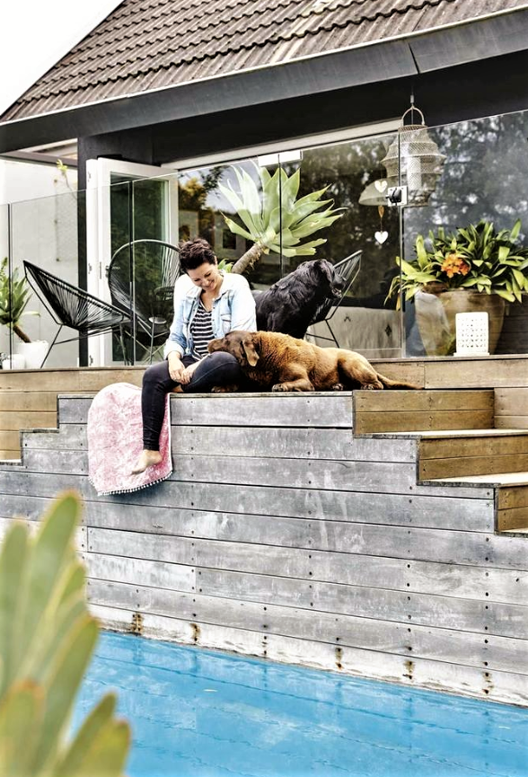 Этот дом был построен в 70-х годах прошлого века в Австралии и достался нашей героини от бабушки. Сама хозяйка живет здесь со своим сыном и двумя собаками. Ремонт данного дома начался еще 10 лет назад, и из-за того, что хозяйка с сыном пытаются делать все своими руками с ограниченным бюджетом, ремонт затянулся аж на 10 лет. Всё преображение началось с ремонта фасада и крыльца. Одну стену хозяйка решила полностью заменить на панорамное остекление. К тому же эта стена выходит прямо к бассейну. Теперь, благодаря такому приему, на первом этаже всегда много естественного освещения. Интерьер дома решили обыграть светлыми цветами с темными акцентами, так как контрастное сочетание очень нравится нашим героям и еще долго будет в моде. Одну стену решили сделать акцентной и украсили ее множеством различных фотографий. Хозяйская спальня имеет ту же цветовую гамму, что и у всего остального дома. Стену вокруг двуспальной кровати выкрасили в темный оттенок. Одну из комнат отдали для шестнадцатилетн