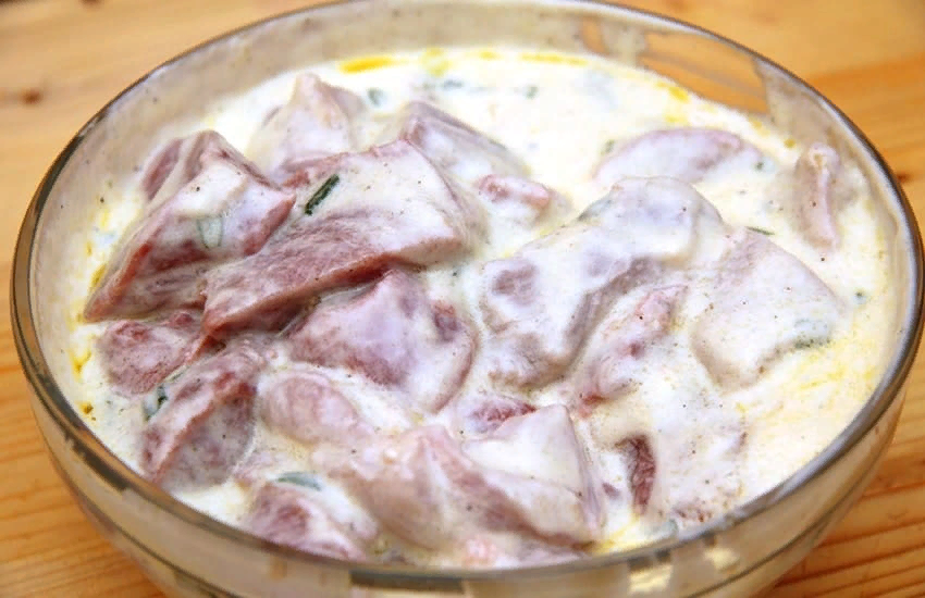 Шаг 3. По истечении времени подливаем в посуду с шашлыком кефир и даем постоять еще около 3-4 часов для пропитки.