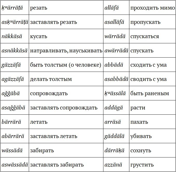 Условие Даны амхарские глаголы и их переводы на русский язык: Задание 1 Переведите на русский язык: Задание 2 Переведите на амхарский язык: Примечание ğ, ḳ, ḳʷ, ṭ – особые согласные, ä – особый гласный амхарского языка. Видеоразбор