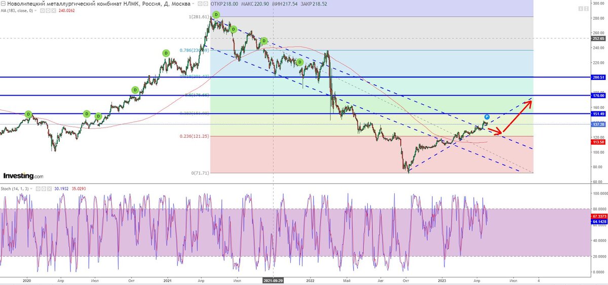 🛠Техническая картина - как и весь российский рынок, НЛМК сильно просел после февраля 2022 года, и в отличие от многих других компаний, падал почти весь 2022 год, в моменте теряя 70% капитализации, однако мощный импульс октября позволил прорвать вверх нисходящий канал и долгосрочную скользящую среднюю, и