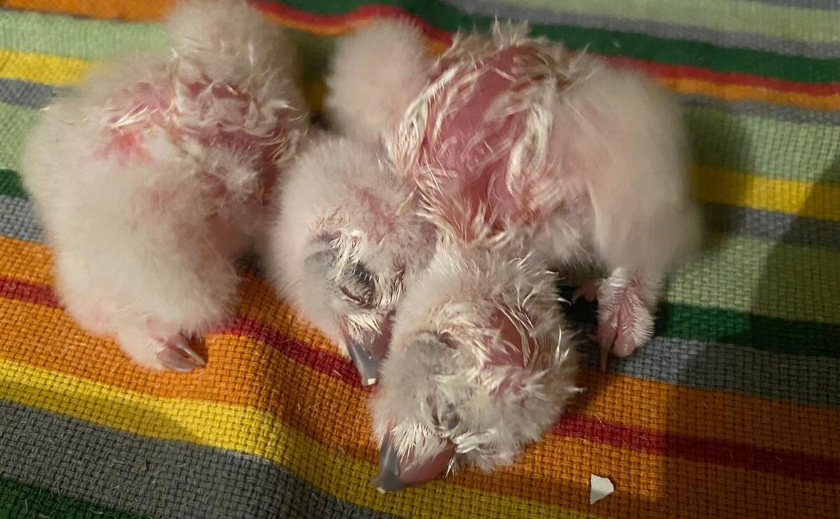 Первым вылупился вороненок из яйца, которое немного треснуло при транспортировке. В это же время в своих «домиках» уже довольно громко пищали совята, заявляя о своём скором появлении.