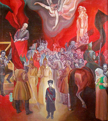 Картина Анатолия Кашкуревича «Ленин выступает на открытии памятника "Степан Разин с ватагой"» (в действительности Ленин выступал не с трибуны). Пример современного белогвардейского творчества. Даже сейчас это событие не оставляет булкохрустов равнодушными