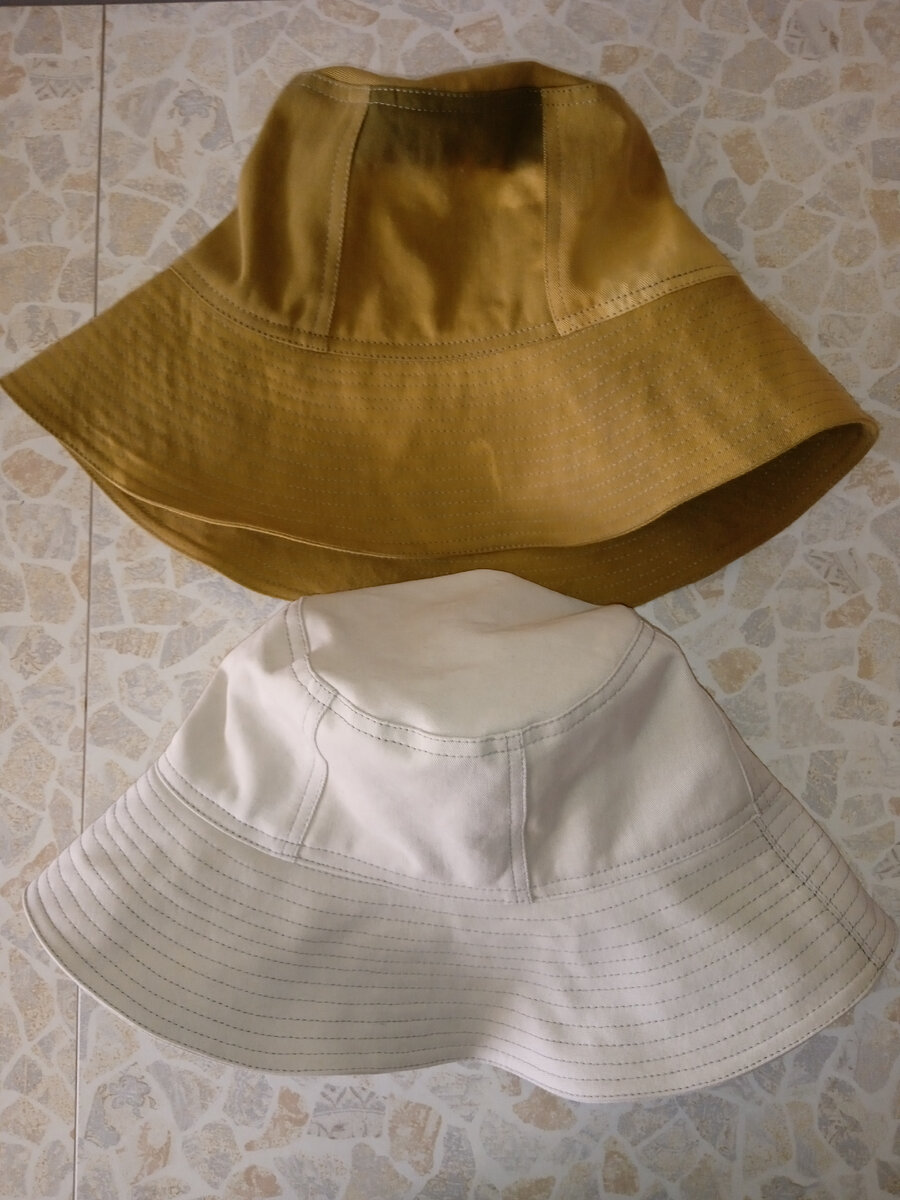 На такую панаму уходит довольно много ткани. На белую панаму ушли длинные мужские шорты большого размера, на вторую - кофта от старой спецовки, только рукава остались. На самую первую панаму, выкройка и описание работы здесь, ушла женская юбка большого размера. Сначала выкроила детали двух панам, немного увеличила изначальную выкройку. Собрала среднюю часть из шести деталей и сразу отстрочила все швы на 0,1 и 0,5 см. Приметала макушку. Выкроила слишком большой круг, поэтому, после того, как сострочила, пришлось срезать лишнюю ткань. Двойной строчкой закрепила шов. Поля панамы соединить по бокам и разутюжить швы, отстрочка необязательна. Промерить внутреннюю часть полей и низ основной детали, чтобы совпали. Если есть несовпадение, корректировать за счет бокового шва полей. Затем сколоть верхнюю и нижнюю часть полей и соединить строчкой на 0,5 см. от края. Вывернуть на лицевую сторону и отстрочить на 0,1 см. Отстрочить поля параллельными строчками, начиная от первой отделочной строчки. Ч