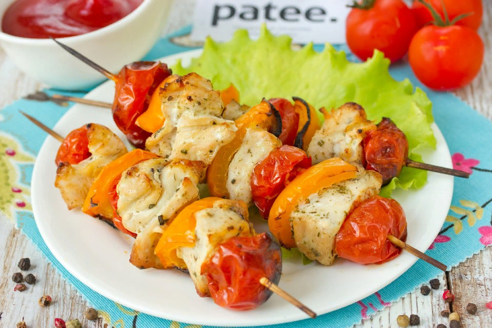 Нанизываю мясо на шпажки, чередуя с овощами.