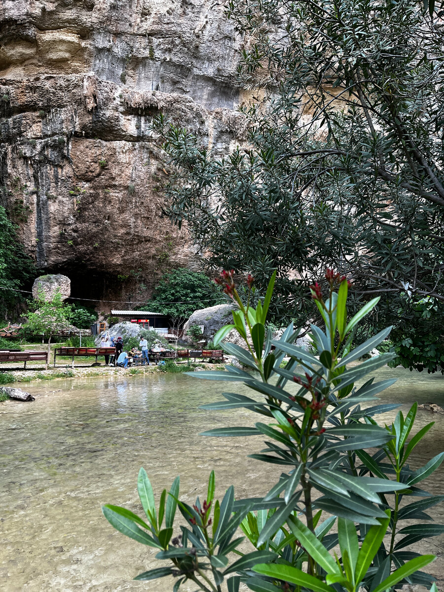 В Турции огромное количество красивейших каньонов, живописных мест в горах с водопадами и горными речками. Во многих таких местах устроились местные бизнесмены, предлагающие аренду столиков, мангалов для пикника. Про одно из таких мест в сегодняшней статье. Недалеко от Эрдемли, в местечке Лимонлу, есть место для пикника с очень красивой природой. Путь на подъезде к месту сужается до узкой тропы вдоль высоченной скалы. Очень атмосферная дорога! Обратите внимание - мест для разворота машины немного. Обратите внимание - мест для разворота машины немного. Очень атмосферная дорога! Примечательно место не только красивым видом на горную реку и высотой скал, но и изюминкой в виде пещер, вырубленных ровной линией на большой высоте. Наверное именно ради пещер стоит приехать в это местечко. Впечатляет! Есть развлечение и для экстремалов - между скалами на высоте натянут трос, на котором можно "поболтаться" и полюбоваться видами с высоты птичьего полета: Столики для пикника расположились во