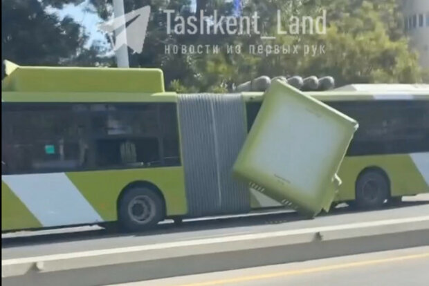Согласно имеющимся данным, у нового сочленённого автобуса King Long, курсирующего по маршруту №24, ехавшего по выделенной линии в Юнусабадском районе Ташкента, отлетел защитный кожух (футляр для механизмов или их частей), закрывающий газовые баллоны на крыше машины.