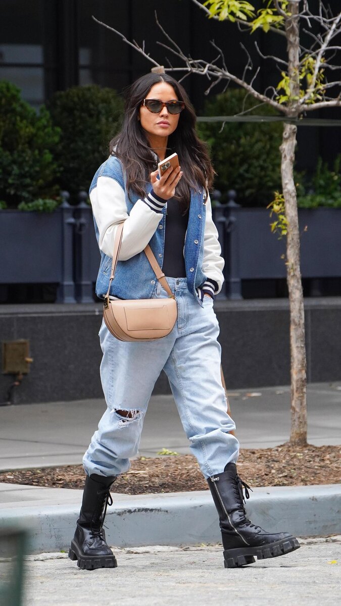 Эйса Гонсалес часто демонстрирует необычные стилевые приемы, и этот — один из них. Актриса появилась облегающем черном топе, поверх которого она надела бомбер со вставками из денима, и светло-голубых джинсах с рваными коленками. Штанины знаменитость заправила в высокие грубые ботинки на шнуровке — такой прием используют самые смелые и модные девушки. Завершила она выход бежевой фактурной сумкой и стильными солнцезащитными очками. Читайте также на нашем сайте: Подписывайтесь на нас в Телеграме, чтобы быть в курсе последних новостей!