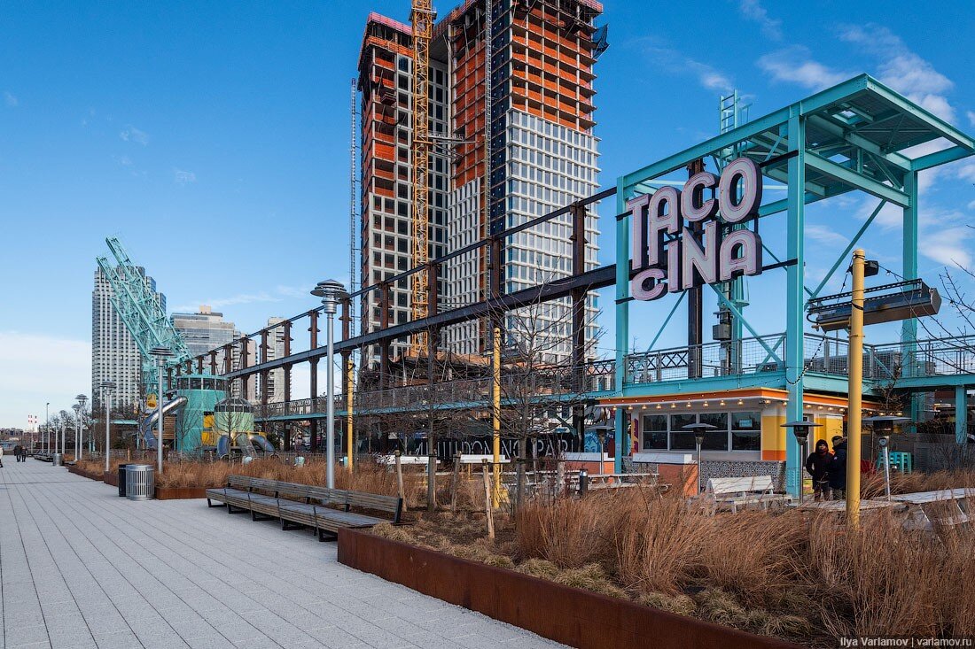 А где у нас хорошее благоустройство? Например, в Нью-Йорке. На этой фразе у кого-то из читателей обязательно пригорит, и он полезет искать картинки с бомжами, засранным метро и ужасными дорогами. Да-да, санитары, дайте пациенту таблеточку... А мы продолжим. В 2019 году в Нью-Йорке открыли просто шикарную набережную на месте бывшего сахарного завода. Там большая территория под реконструкцию, пока я там был дома только строили, но вот парк уже открыли. Он называется Домино (в честь бывшей фабрики). И парк получился просто сказочно хорош! Давайте посмотрим, как надо делать благоустройство.