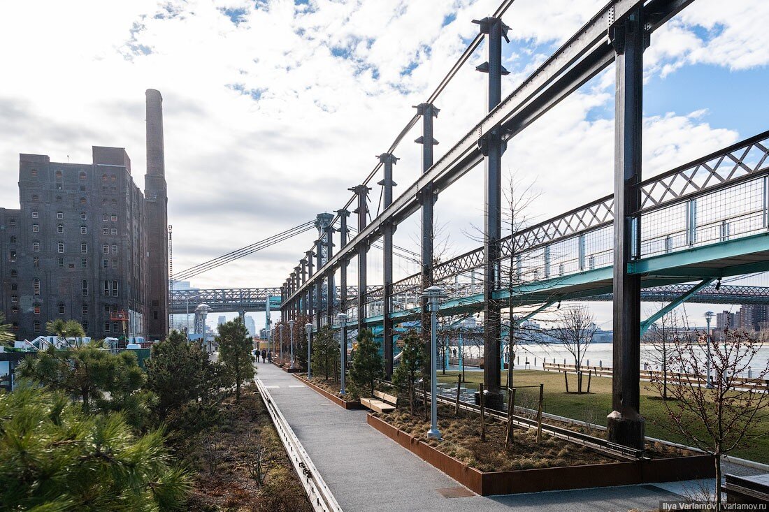 01. Как я уже сказал, тут был сахарный завод – большая промзона, выходящая прямо к воде. Подобных территорий много по всему миру. Раньше заводы строили у воды. Во-первых, была нужна сама вода. Во-вторых, реки были естественными транспортными артериями для доставки сырья на завод и отправки продукции. Со временем заводы, которые раньше были на окраинах городов, стали занимать очень дорогую землю почти в центре, производство мешало жить людям, портило экологию, да и вообще часто морально устаревало. Заводы закрывали, переносили, и возникал вопрос: а что делать с промзоной? Вот в Нью-Йорке её реконструируют. Нас интересует в первую очередь парк. Обратите внимание, что сердце парка – это не только здание самого завода, но и остатки каких-то конструкций и старые портовые краны.