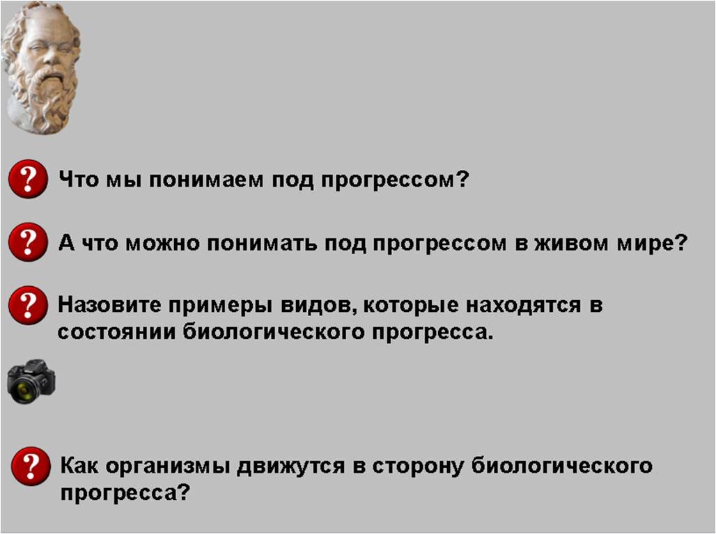 Да, вы не ослышались - «сократовский». Идея родилась на курсах повышения квалификации. Помнится, мы в очередной сто двадцать первый раз изучали философию и, в числе прочего, педагогический опыт товарища Сократа. Как известно, Сократ ничего не объяснял. Он задавал вопросы, отвечая на которые, ученик сам приходил к верному ответу. Я прожила в школе 26 лет. Теперь я счастливая неунывающая пенсионерка, дорвавшаяся до интернета. Люблю готовить, вышивать, гулять и смотреть кино. Делюсь с читателями всем, что есть за душой. А еще выкладываю на канале все, что наработала за школьные годы. Может быть, кому-то пригодится. Пользуйтесь на здоровье! И что-то мне захотелось попробовать пойти тем же путем. Ближайший урок был посвящен направлениям эволюции, с него и начала. На титульном слайде урока помещен портрет Сократа без подписи. При хорошем учителе истории школьники, как правило, узнают его, хотя бы путем перебора известных им имен древнегреческих философов. Коротко сообщаю, к чему здесь этот п