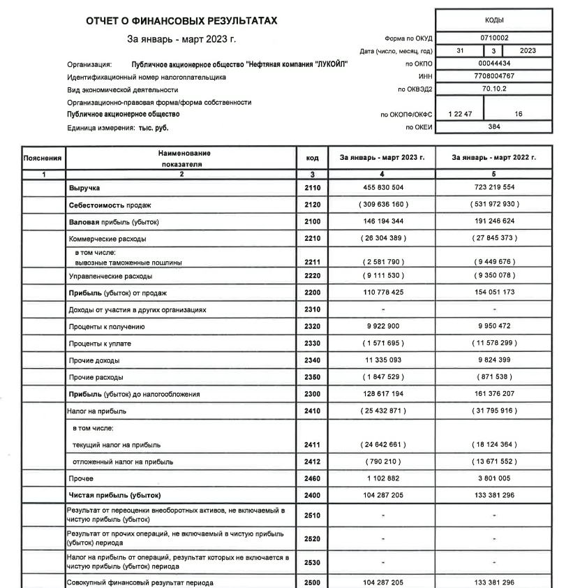 ⛽️ Лукойл опубликовал финансовые результаты по РСБУ за I квартал 2023 года. Думаю, что многие частные инвесторы не были удивлены снижению финансовых показателей компании. Я ещё в разборе годового отчёта Лукойла отмечал, что в 2023 году не стоит ожидать повторения результатов 2022 года по ряду причин, которые мы с вами обсудим ниже, а сейчас давайте рассмотрим основные показатели эмитента за I квартал 2023 года: