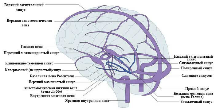 Венозные синусы - реки, по которым оттекает венозная кровь от головы. До 95% венозной крови собирается в венозных синусах и покидает краниальную область (область черепа) через яремные отверстия. Центральные синусы. 1. Верхний сагиттальный синус простирается от слепого отверстия до внутреннего затылочного бугра – место слияния синусов. Опустошается в поперечный синус, преимущественно правый. 2. Нижний сагиттальный синус располагается в задних 2/3 свободного края большого серповидного отростка твердой моховой оболочки. Опустошается в прямой синус. 3. Прямой синус располагается в