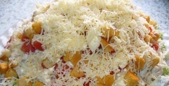5. Украсить по желанию. 2) САЛАТ С КУРИЦЕЙ И СУХАРИКАМИ ИНГРЕДИЕНТЫ: