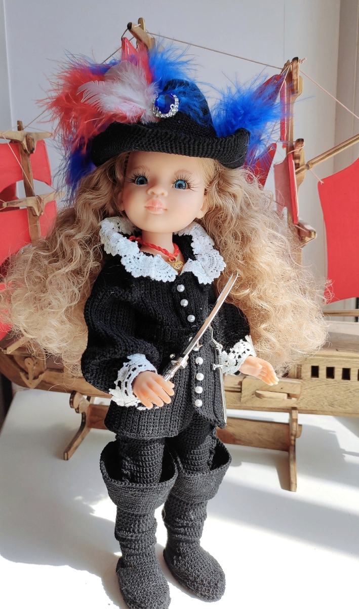 Всем большой привет ! Героиня романа Александра Дюма «Три мушкетёра» : злодейка-обольстительница, шпионка кардинала Ришельё, один из главных антигероев романа, супруга Атоса в прошлом. В романе внешность Миледи автор описывал так: «Миледи была молода и красива. Это была бледная белокурая женщина с длинными локонами, спускавшимися до самых плеч, с голубыми томными глазами, с розовыми губками и белыми, словно алебастр, руками. Миледи или леди Винтер завораживала всех своей красотой. У неё были изысканные манеры, дивный взор, и кроткий нрав». Долго искала образ, чтобы подошел к костюму Миледи и вот все сложилось, куколка идеально подошла под образ Маргариты Тереховой, мне даже кажется они похожи. И для меня никогда не будет другой Миледи, кроме Маргариты Тереховой. И оказывается, она сама придумала для своей героини мужской костюм: черная рубашка, подхваченная ремнем, лосины, сапоги, черный плащ и шляпа с пером. Ну а как это выглядит на куколке предлагаю вам посмотреть:
