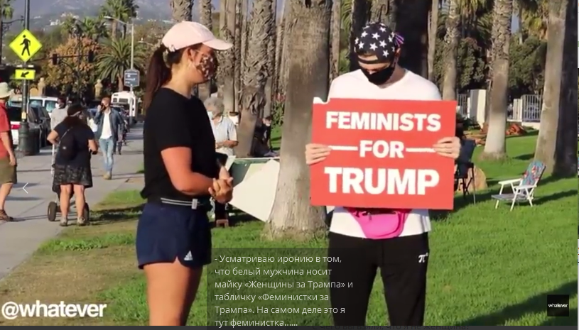 Активисты там потому так и называются, что им всё никак не сидится. Всё бы хорошо, да что-то не хорошо. Прямо как гвоздь в стуле. Наблюдаем и мотаем на ус. Вот в самом центре вселенской свободы и демократии народ готовится выбрать себе лидера, президента. Ну как тут без прекрасной половины?! И американские активистки, полные горячей любви, организуют массовые мероприятия и призывают голосовать за своего кандидата. Прямо-таки праздник свободы и демократии. С плакатами «Феминистки за трампа» они обояли просторы политического поля. Однако… Внимательному взору активной активистки открылась вопиющая во весь американский голос картина: в ряды прекрасных активисток затесалось нечто иное. В смысле с иными гендерными признаками. Причем, явно противуположного полу! Не бывать такому! — решила активистка. И набросилась (по правде сказать, лишь словесно, то есть, как бы устно, то есть орально) на эдакое несовершенство: – Усматриваю иронию в том, что белый мужчина носит майку «Женщины за Трампа» и