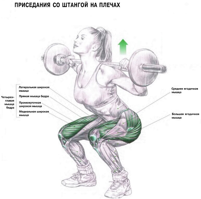 1. Приседания со штангой - станьте на плечи с штангой на спине, опустите таз до уровня коленей, затем поднимите вверх. Повторите 3-4 подхода по 10-12 раз. 2. Жим ногами на тренажере - сядьте на тренажер, положите ноги на платформу и отжимайте ее, затем верните в исходное положение. Повторите 3-4 подхода по 10-12 раз. 3. Выпады со штангой - станьте на плечи с штангой на спине, сделайте шаг вперед и опустите таз до уровня колена, затем верните в исходное положение. Повторите 3-4 подхода по 10-12 раз для каждой ноги. 4. Жим одной ноги на тренажере - сядьте на тренажер, положите одну ногу на платформу и отжимайте ее, затем верните в исходное положение. Повторите 3-4 подхода по 10-12 раз для каждой ноги. 5. Становая тяга со штангой - возьмите штангу в руки, станьте прямо и опустите ее до уровня коленей, затем поднимите вверх. Повторите 3-4 подхода по 10-12 раз.