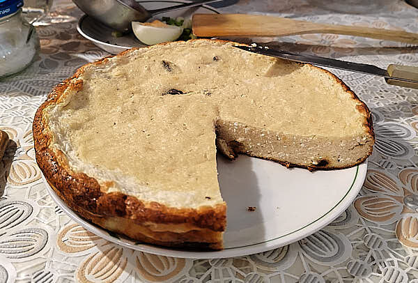 № Ингридиент Количетво 1 Сахар 50 г. 2 Манная крупа 40 г. 3 Творог 500 г. 4 Яйца 3 шт. / 150 г. 5 Изюм 50 г. 6 Соль 5 г. 7 Масло сливочное 10 г.