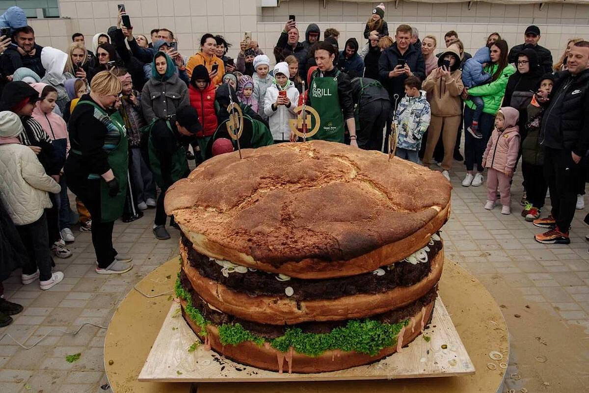 В Анапе приготовили бургер в 759 килограмм В одном из пятизвёхдочных отелей Анапы (Краснодарский край) состоялся ежегодный гастрофестиваль, приготовление гигантского бургера с самого начала заявили главным событием. Чтобы попасть в «Книгу рекордов России» поварам пришлось постараться, а мясные котлеты привозили к месту приготовления на машине. Вес бургера составил 759 килограммов, высота – 77 см, а диаметр 154 см. И это официально самый большой бургер в стране, - подтвердил главред «Книги рекордов России» Станислав Коненко. Две мясные котлеты были приготовлены на гриле, а булочки были с кунжутом. Потом блюдо разошлось по тарелкам. Ещё больше новостей на сайте «Изнанка»