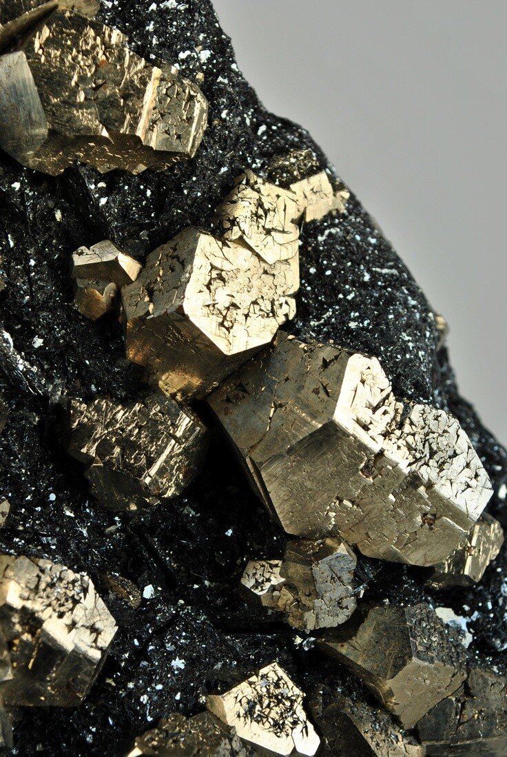 Название пирит произошло от греческого слова "пирос"- огонь, благодаря его свойству высекать искры при ударе. Так же его называют серным или железным колчеданом. Находится в природе в виде хорошо обработанных кристаллов, зернистых масс и включений в минералах и горных породах. Форма его кристаллов образует собой кубы, октаэдры и более сложные с двойниками прорастания. Хорошо сформированные кристаллы украшают минералогические коллекции, особенно популярен пирит кубической формы, а так же "пиритовые доллары" (дисковидные сферолиты) Благодаря жёлтому, латунному цвету и металлическому блеску его прозвали "золотом дураков", так как уж очень похож на золотой самородок. Но знающие люди конечно никогда не спутают золото с пиритом, даже просто бегло взглянув, ибо природное золото не имеет четких форм, в отличие от искрящегося своими гранями красавца. Пирит является железной рудой и сырьём для добычи серы. В начале эпохи радио, минерал использовали для производства полупроводниковых диодов.
