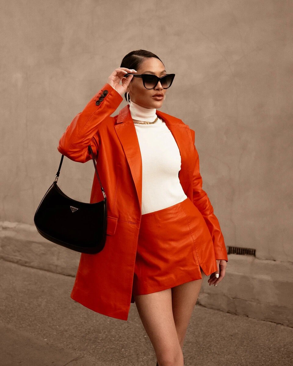 ✔️ Чем сильнее выражен доминантный цвет, тем меньше его растяжка в образе. К примеру, если поменять цвет наших топа и жакета на зеленый, то оттенок должен совпадать на обеих вещах. Хорошим дополнением будет нейтральная сумка: белая или черная.
