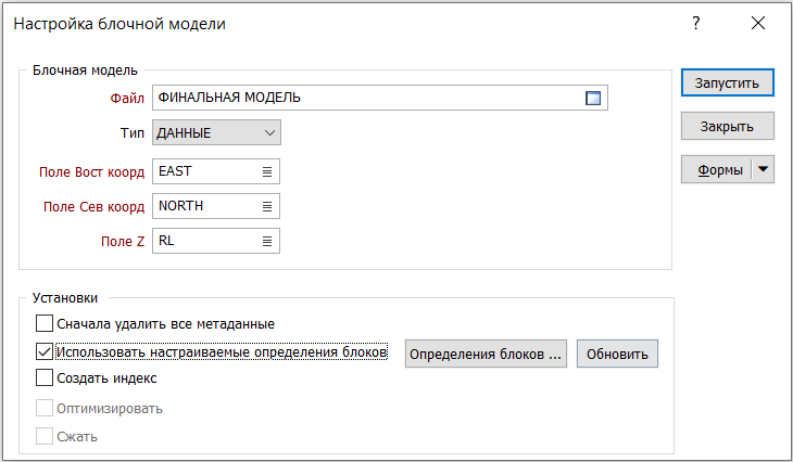 В окне Настройка блочной модели выберите ваш файл блочной модели и сделайте активной опцию Использовать настраиваемые определения блоков, далее нажмите кнопку Обновить.
