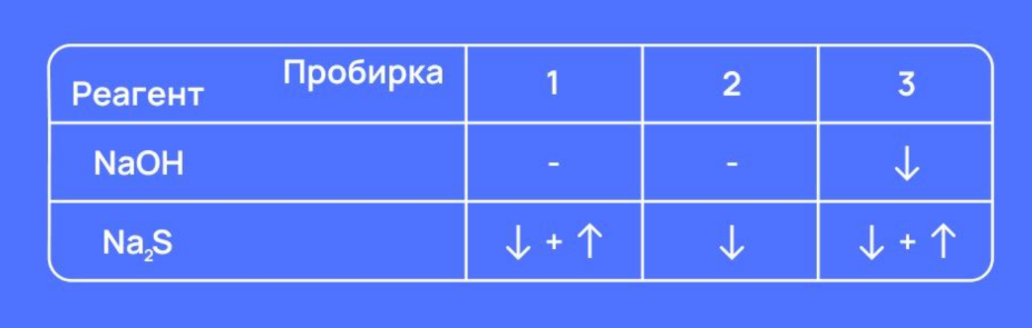Условие В четырех зашифрованных номерами 1-4 пробирках находятся растворы MgCl₂, AlCl₃, BiCl₃ и ZnCl₂. Юный химик провел качественные реакции с избытком разбавленного раствора NaOH и раствором Na₂S, а данные исследования записывал в таблицу на листке бумаги в виде условных обозначений. Придя домой, он обнаружил, что часть листа с колонкой пробирки №4 оторвалась и потерялась. Все осадки в таблице имеют белый цвет. Вопрос Помогите химику определить содержимое всех пробирок. Видеоразбор