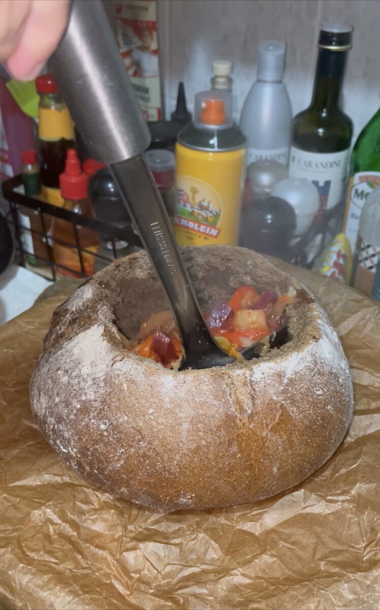 И ТАК !Кто хочет подать красиво борщ в хлебе ! Я вчера поторопилась и налила борщ просто в хлеб ,естественно всю жидкость хлеб впитал и мне пришлось есть овощи 🤣ну это моя вина ,я все бегом бегом ! А для того чтобы хлеб не впитал борщ и служил полноценной тарелкой,нужно смазать внутри яйцом с солью и убрать в духовку ,чтобы получилась пленка ! А я учусь на своих ошибках 🤣