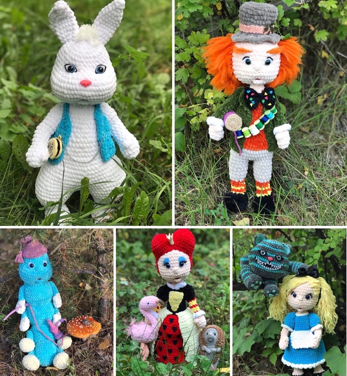 Очень часто я вяжу серии игрушек. Планирую одну , а потом не могу остановиться и вяжу всех героев , связанных с первым… Так получилось и несколько лет назад, когда я захотела связать Алису . За ней появился Чеширский кот , потом Шляпник Синяя гусеница , и королева Очень люблю эту сказку и с огромным удовольствием вязала всех героев . Рост получился у всех довольно внушительный 30-40 см, одежда не съёмная, связаны из плюшевой пряжи . Кстати, почти на всю серию есть бесплатные МК 😉
