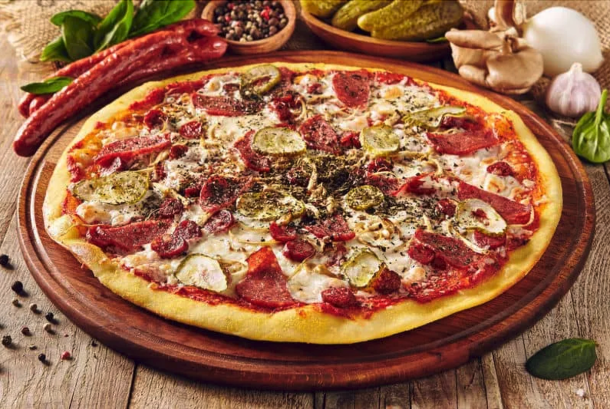 Пицца по-деревенски с копчёными колбасками и маринованными огурцами