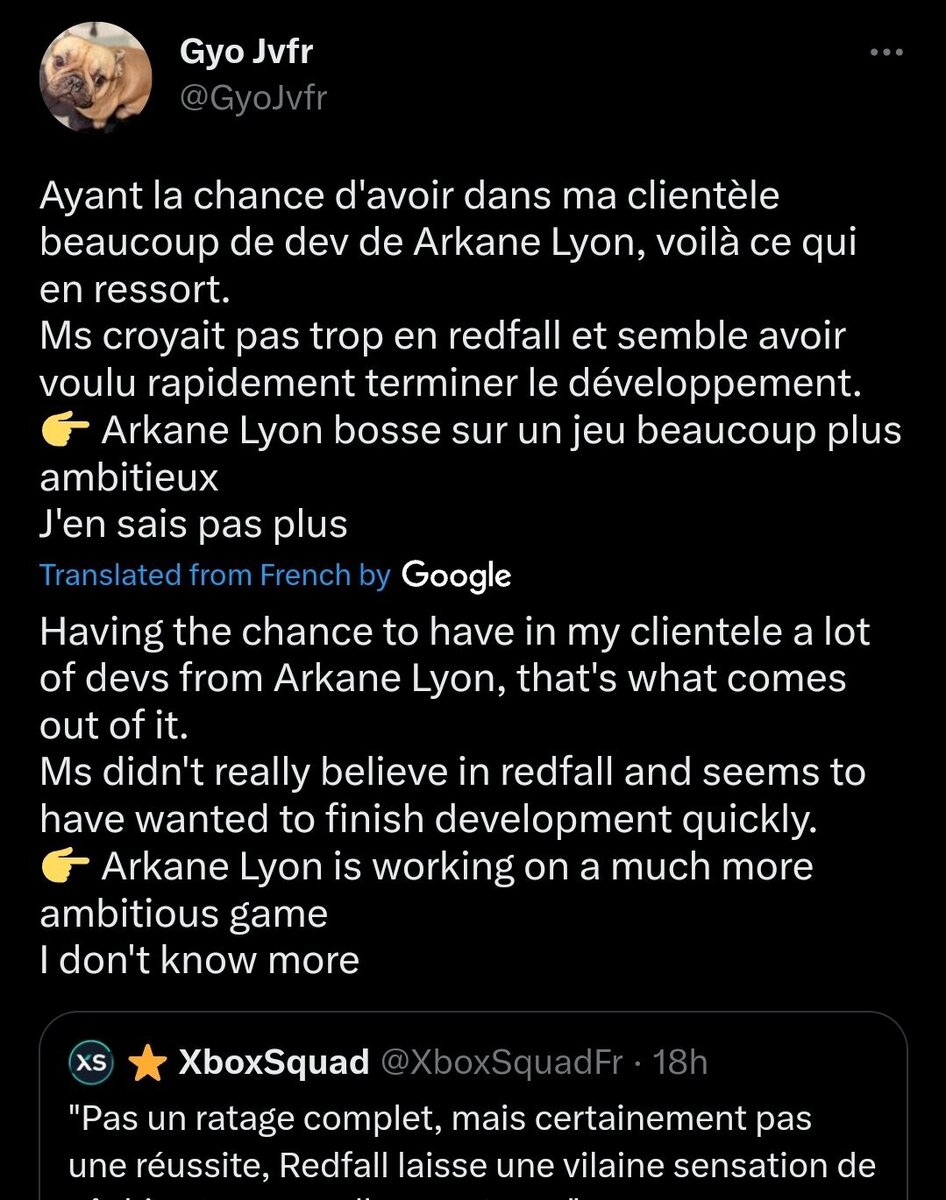Пользователь твиттера Gyo Jvfr, работающий во французском игровом магазине, рассказал о ситуации вокруг Redfall, ссылаясь на сотрудников Arkane Lyon, которые якобы к нему периодически захаживают. По их словам, Microsoft не верила в кооперативный шутер Arkane Austin и хотела как можно быстрее прекратить разработку и выпустить игру. Также пользователь рассказал, что Arkane Lyon (Deathloop, Dishonored 1-2) работает над "куда более амбициозной игрой". Как обстояли дела с разработкой Redfall на самом деле, неизвестно. После релиза игры появилось множество рецензий, в которой обозреватели отмечали, что Redfall не дотягивает даже до спорных Dishonored: Death of the Outsider и Deathloop. Redfall доступна на PC, Xbox Series X|S и Game Pass.