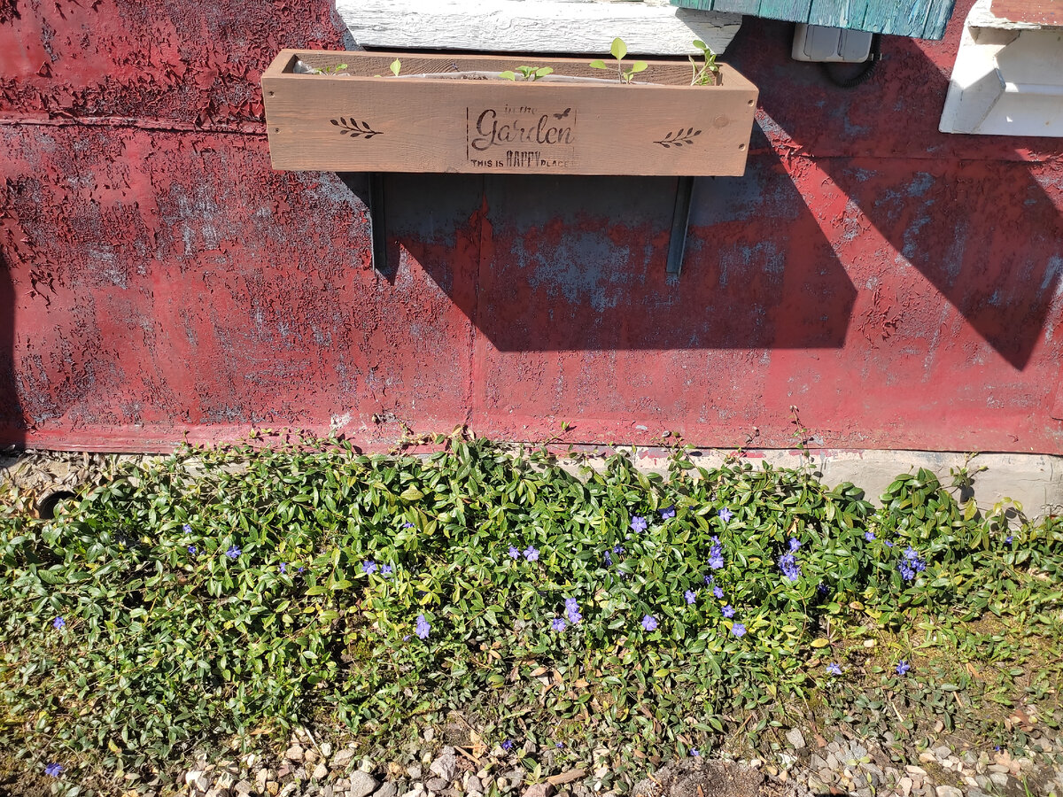 Добрый день всем! На смену апрельским цветам пришли майские цветочки. Начинает зацветать барвинок. Это вечнозелёный почвопокровник, очень хорошо разрастается. У меня он растёт вдоль бани.