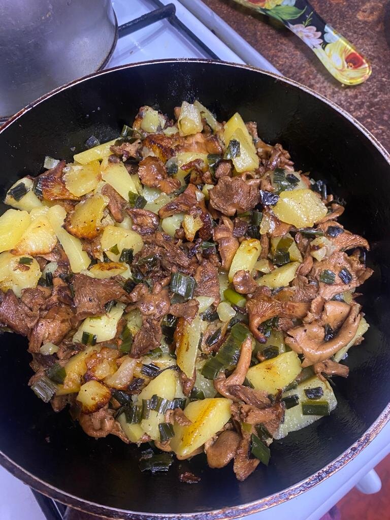 Продолжаем освобождать холодильник от замороженных продуктов. Думаю у каждой хозяйки найдутся в морозилке замороженные грибы, если нет - можно использовать и свежие вешенки. Сейчас подрос свежий молодой чеснок, лук порей и другая зелень, которую можно и нужно использовать при жарке. Из грибов у меня сейчас -лисички. Готовится все очень быстро, но как вкусно и ароматно! Продукты: Нарезанный чеснок и лук порей чуть поджариваем на сливочном масле. Размороженные грибы, моем, обсушиваем, добавляем к припущенной зелени и обжариваем на сковороде минут 15 до готовности. Отдельно обжариваем картофель 15-20 мин. Все соединяем и тушим минут пять. Подаем на стол с зеленью салата или соленьями. Приятного аппетита. Подписывайтесь, если понравился рецепт. Спасибо за вашу доброту.