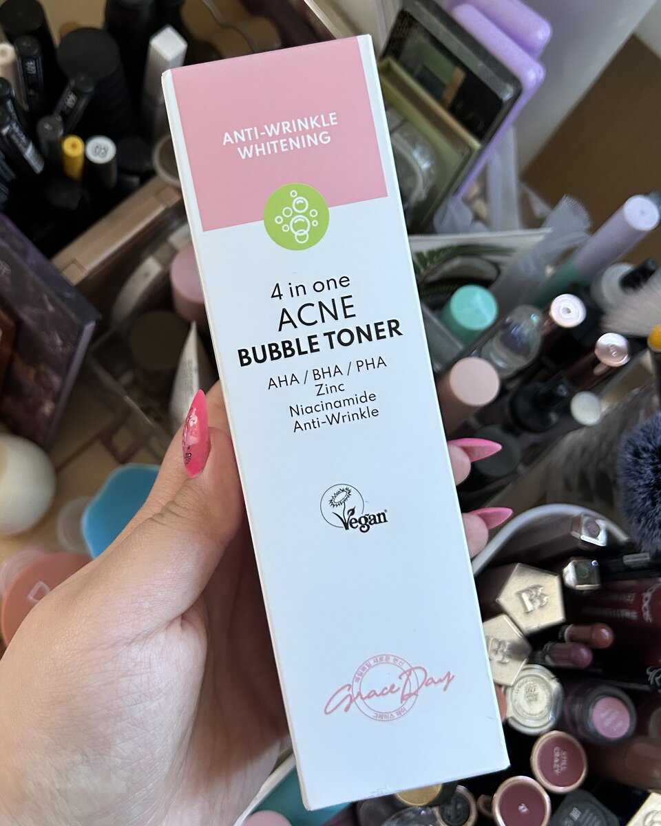 Привет, Красотки 🌸 Сегодня хочу рассказать про Тонер для лица Grace day 4 in one Acne bubble toner В настоящее время наш бьюти рынок переживает самый настоящий корейский бум, куда не посмотри везде корейские бренды и с каждым днем их больше и больше. Плохо ли это? С одной стороны да, ведь разводись умельцы, которые торгуюсь палью на любой вкус и цвет, а так же появилось множество не до корейских брендов, которые от корейского имеют только упаковку, а производят их совсем не на родине BTS И так, до этого я пользовалась на постоянной основе косметикой Бренда Cosrx, но чем популярнее бренд становился, тем цены на него все больше увеличивались. Поэтому я направилась на поиски чего-то более бюджетного В «Подружке» увидела новый для себя бренд Grace day и акцию на него 1+1=3, и таким образом на моей бьюти полке в ванной появился он. Без акции его стоимость 800₽ Скажу честно, я первый раз пользовалась бабл тонером, и это очень Крутая штука. Благодаря пузырькам, тонер быстро впитываетс
