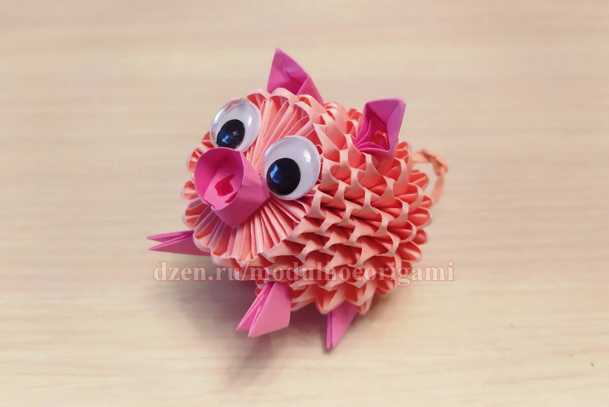 Здравствуйте, Друзья! Сегодня предлагаю собрать ПОРОСЕНКА. Список мастер классов. Для поросенка нам понадобится 167 модуля: 160 розовых и 7 ярко-розовых. Как собирать модули, можно посмотреть здесь. Собираем одновременно первые 3 ряда по 16 розовых модулей в каждом. Первый ряд собираем короткой стороной вверх, второй и третий ряды широкой стороной вверх, ряды замыкаем в кольцо. Четвертый ряд 16 розовых модулей. Выворачиваем заготовку, опуская края книзу. Соберем еще 6 рядов по 16 модулей в каждом. Всего должно получиться 10 рядов. Из ярко-розового модуля изготовим и прикрепим пятачок. Из 4 ярко-розовых модулей изготавливаем лапки. Изготавливаем ушки. При помощи скручивания розового прямоугольника (заготовки для модуля) изготавливаем хвостик. Крепим ушки и хвостик. Приклеиваем глазки. Глазки можно вырезать и раскрасить из бумаги, я использовал покупные. Поздравляю, наш ПОРОСЕНОК готов!!! Не забывайте подписаться на канал, чтобы не пропустить самое интересное, впереди вас ждет много увле