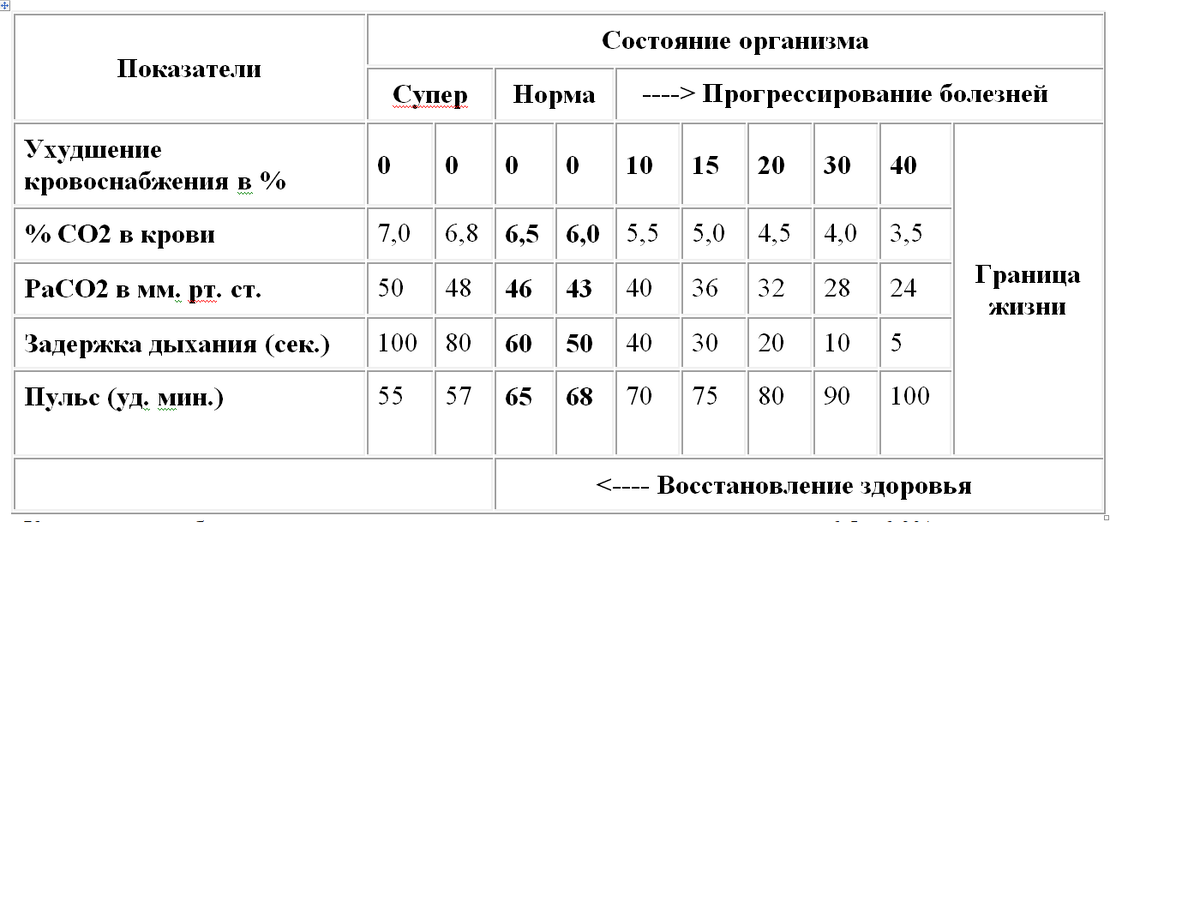 Индикатором ухудшения кровоснабжения тканей в человеческом организме может служить процентное содержание углекислого газа в артериальной крови. Оценить уровень кровоснабжения можно по таблице «Состояние организма». Как видно из таблицы, при содержании углекислого газа в крови не менее 6,5 - 6,0% кровоснабжение органов максимально возможное - уменьшение кровотока составляет 0%. Такое кровоснабжение наблюдается у всех здоровых людей в возрасте 20 - 25 лет, а также у пожилых людей, всю жизнь придерживавшихся здорового образа жизни. На Земле есть несколько районов, известных долгожительством и отменным здоровьем тамошних обитателей. Так вот, анализы, проведённые исследователями, показали стопроцентное кровоснабжение у этих людей в возрасте даже за семьдесят. И у них процент содержания углекислого газа в крови был близок к норме. В России же у большинства людей старше сорока лет процент содержания углекислого газа 4,5 - 4,0%, что означает ухудшение кровоснабжения на 20 - 30%. Оно возникает