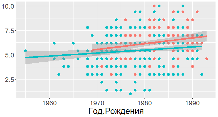 На диаграмме: по оси X – год рождения (заметьте, чем моложе, тем чаще гражданский, а не официальный брак), по оси Y – данные по шкале интроверсия – экстраверсия (чем выше результат, тем больше интроверсии, и наоборот).