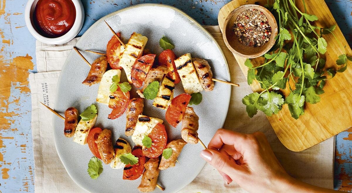 Закуска из адыгейского сыра с колбасками и помидорами на гриле: можно приготовить и на уличном гриле, и дома на гриль-сковороде