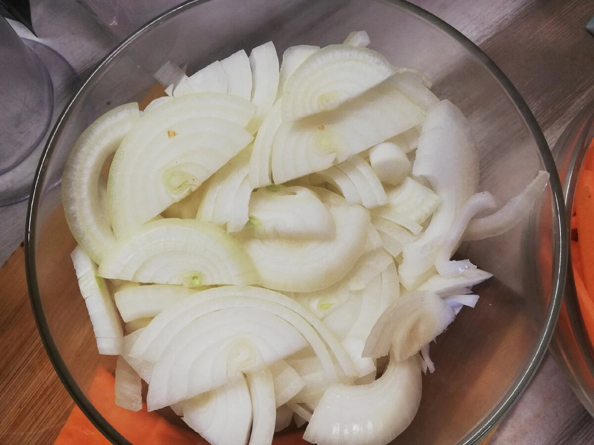Доброго дня, читающим. Недавно муж делал плов. Ну такой он у него вкусный получается. Делюсь рецептом. Ингридиенты: Сало - 200 грамм Масло – 150 грамм Мясо - 600 грамм Лук - 300 грамм Морковь - 600 грамм Рис - 400 грамм Соль - 10-12 грамм Зира - 10 грамм Чеснок – одна головка Красный сушеный острый перец – 1-2 стручка (по вкусу) Первым делом необходимо подготовить ингредиенты. Лук чистим и нарезаем полукольцами примерно 0,5-1 сантиметр в толщину. Морковь режем на пластины по 5 сантиметров в длину и 0,3 - 0,5 сантиметра в ширину. А затем пластинки нарезаем на бруски около 0,3- 0,5 см в ширину. Сало, использовано свиное, но и баранье курдючное сало дает очень хороший вкус, режем некрупным кубиком, примерно по 2-3 сантиметра. Так же поступаем и с мясом, режем на некрупные кусочки по 1,5- 2 сантиметра. Мясо можно использовать любое, в зависимости от предпочтений, было использована свинина (с рёберной части), но так же подходит и говядина, баранина и мясо птицы. Так к
