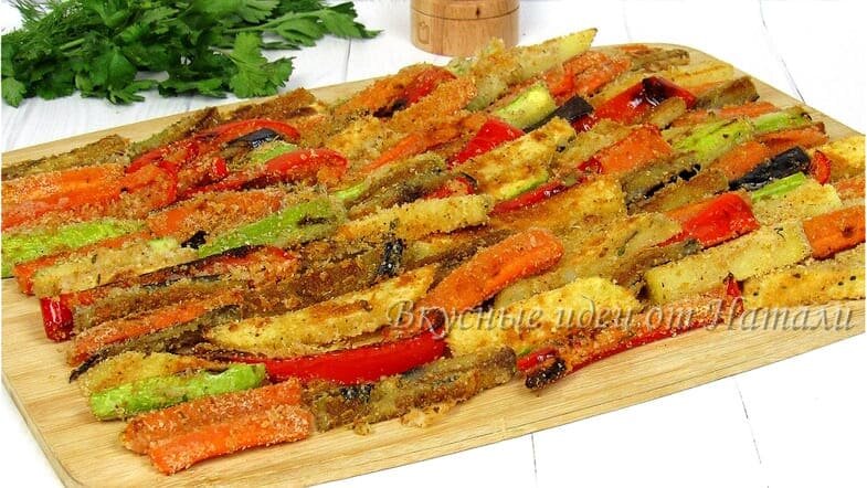 Вкуснейшие запеченные овощи в духовке. Рецепт простой, быстрый, но какие же вкусные получаются овощи. Прекрасное дополнение в любому гарниру, к мясным блюда, к курице, к рыбе, хотя и просто в качестве перекуса разлетятся моментально. Может конечно кому-то этот рецепт и знаком, но для меня он стал вкусным открытием, делюсь и с вами. Подробный процесс приготовления в видео рецепте и пошаговом описании ниже: Рецепт: Как я и писала выше, приготовить такие овощи проще простого. Нарезаем все овощи брусочками. Поливаем их растительным маслом и тщательно перемешиваем. Дальше готовим панировку. Для этого смешиваем натретый на мелкой терке сыр, панировочные сухари, измельченную петрушку, сушеный чеснок, соль и перец. Тоже тщательно перемешиваем. Теперь все кусочки овощей обваливаем в панировке и выкладываем на противень, застеленный фольгой. Сверху ещё чуть-чуть сбрызгиваем растительным маслом и отправляем запекаться. Запекаем в духовке 25 минут, при 200 градусах. Спустя 25 минут овощи готовы. О
