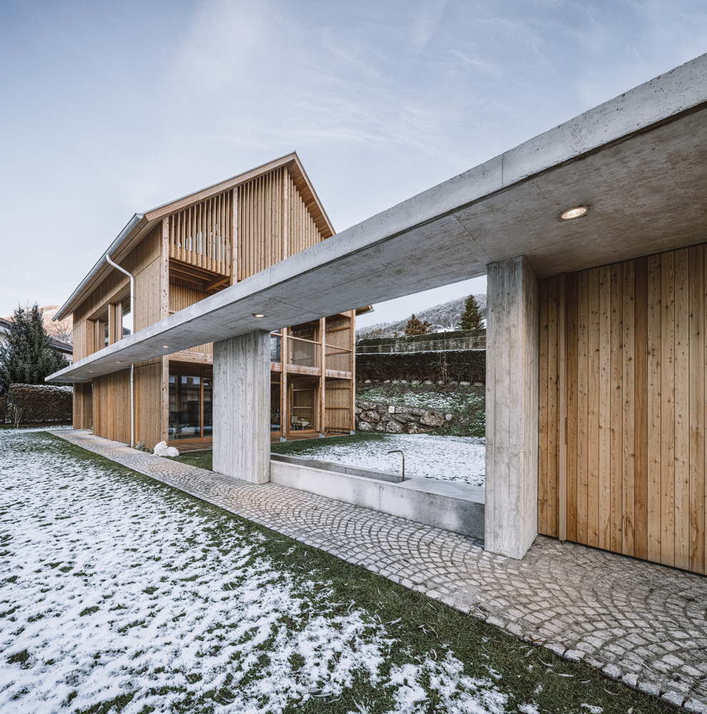 Участок расположен в юго-восточном пригороде Зальцбурга. Неоднородное окружение состоит преимущественно из жилых домов, напоминающих «повседневную архитектуру». Рельеф местности формирует предгорье окружающего горного ландшафта, образуя пологий склон с востока на запад. Общая архитектурная концепция может рассматриваться как утверждение повседневной жизни, а не жёсткая и негибкая конструкция. Такие характеристики, как лёгкость, уединение, открытая и яркая атмосфера, а также плавный переход между внутренним и внешним пространством были главными пожеланиями владельцев. Выбранная специфическая типология «дом с флигелем и входом с навесом» формирует ансамбль, напоминающий ограждающий двор со стороны объездной улицы, обеспечивающий как приватность, так и плавность. Через террасы и балконы всё жилое пространство может быть связано с этой безопасной, но открытой территорией, что также создаёт связь с южным садом. В то время как прямоугольный план этажа и крутая двускатная крыша совпадают с