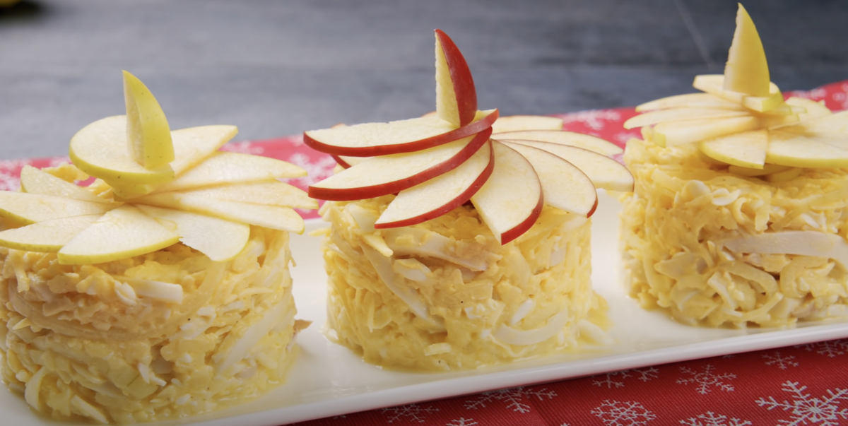 Это салат готовила моя жена на новый год, когда отмечала его у сестры. Прикол в том, что у сестры жил толстый кот по кличке Дымок. А у него просто морда трусится от морепродуктов. Впрочем, у ее сестры тоже. Жена выложила кальмара размораживаться на раковину. Во время готовки она поняла, что на его есть еще один претендент. Кот крался к раковине. Жена решила спрятать кальмар в холодильник. Кот шел за ней. Она закрыла дверцу и услышала истеричное «Мяу». Сестра тогда сказала, что это кот послал ее нецензурными словами… С тех пор у нас этот салат называется Дымком. Для его приготовления нам будут нужны: Оформить можно яблоком. Бонус. Как украсить салат Здесь есть несколько вариантов. Приятного аппетита! Делитесь, как вам рецепт?