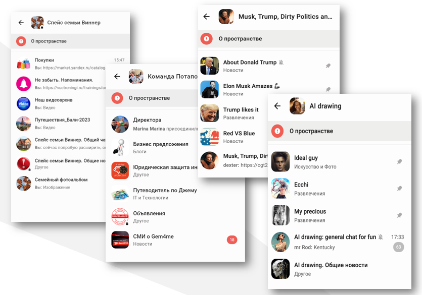 Представленный уникальный функционал "GemSpace" от Gem4me, позволяет объединять различные виды информации под одним сообществом. Они могут быть разнообразными: от закрытых семейных и корпоративных спейсов до открытых блогерских сообществ с десятками тысяч пользователей. В настоящее время каждый пользователь Gem4me имеет возможность создать собственный спейс. Следующие примеры являются яркими иллюстрациями того, как эффективно использовать эксклюзивный функционал. Создание семейного спейса: В современном мире люди редко уделяют время своей семье. Создание семейного спейса поможет установить контакт между членами семьи, обмениваться новостями и фотографиями, создать своеобразный центр семейных событий. Создание корпоративного спейса: Для компаний создание корпоративного спейса может стать идеальным способом интеграции множества информации. Сообщения о собраниях, обновлениях продуктовых линий и фотографии совместных мероприятий могут быть легко опубликованы в спейсе компании. Это позволи
