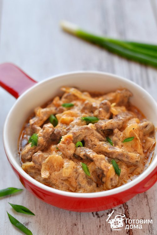 говядина (вырезка или длиннейшая мышца спины)400 глук репчатый2 шт сметана150-200г сливочное масло50 г растительное масло3 ст.л. мука1 ст.л. томатный соус или томатная паста1-2 ст.л. зелень петрушка и соль свежемолотый перец.