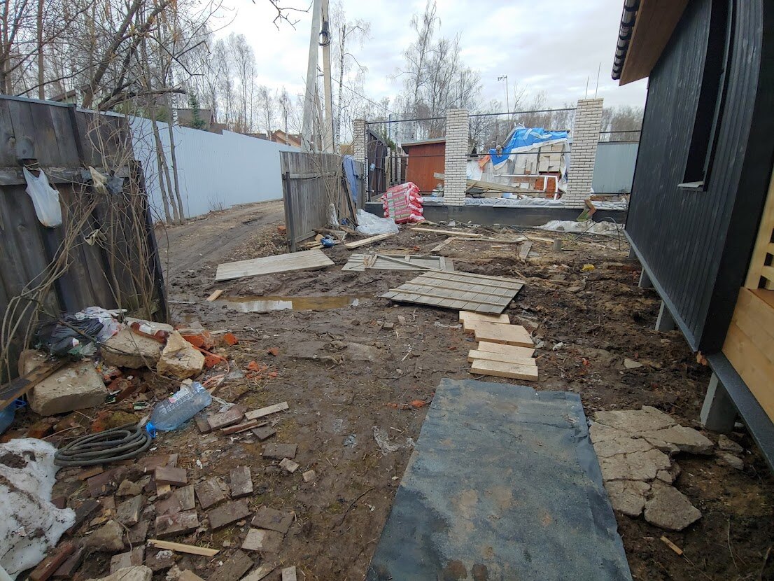 Когда начиналась наша стройка, мы сняли ворота и спилили столб с калиткой. Иначе просто не получалось заехать строительной технике. В апреле прошлого года, когда шли внутренние отделочные работы, это место выглядело так: Позже мы перенесли заезд на другую сторону участка, но здесь еще какое-то время продолжался подвоз материалов и наоборот - вывоз контейнеров с мусором. А потом начались прокладки коммуникаций, и тут долго была куча глины. Мы даже разрешили ходить через участок рабочим, иначе по дороге было какое-то время не пройти. И только в ноябре все закопали и отсыпали дорогу. Но вот пришла весна и настал момент, когда надо восстановить забор. Все же дырка тут странно смотрится. Ворота нам эти не нужны, поэтому они просто станут секциями забора. А вот калитку мы оставим. Это и удобно и прямо за ней наши колодцы водопровода и канализации. Когда откапывали места для столбов, нашли аж 3 старых точки, где были запоры у ворот. Видимо они со временем уходили в землю и на их место вбивали