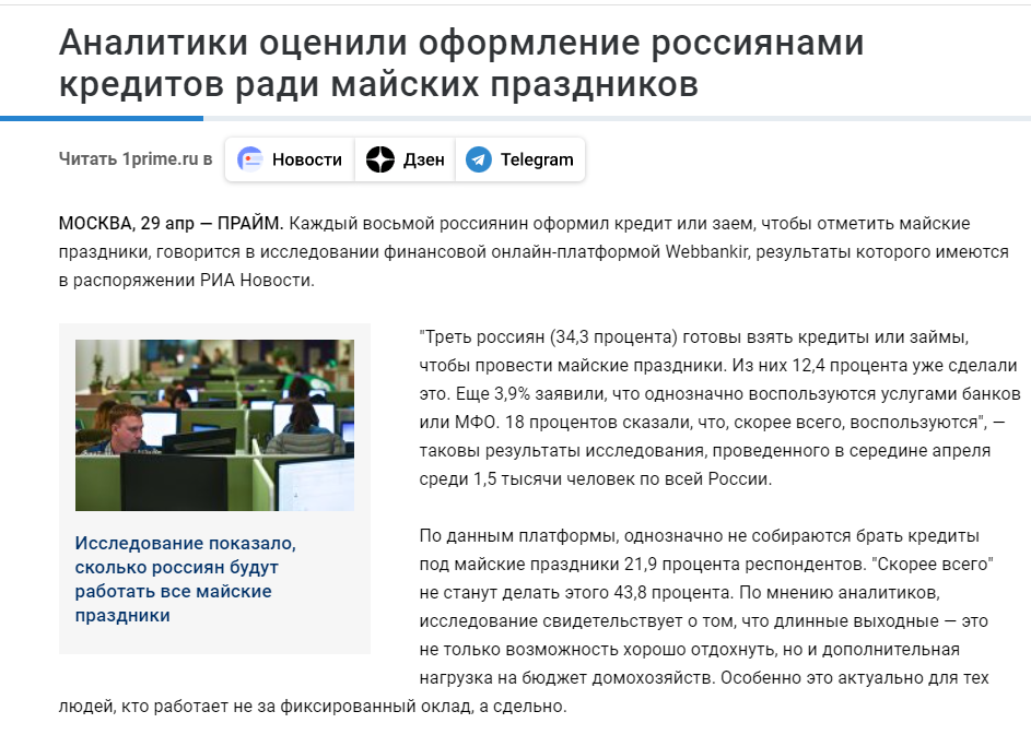 Наткнулся на такую информацию и был просто в шоке. Треть россиян готовы взять кредит ради того, чтобы отметить майские праздники. 12,4 процента уже сделали, наверняка сделает еще процентов 10, учитывая доступность кредитов и, тем более, микрокредитов. Итого порядка четверти россиян готовы взять кредит чтобы погулять, побухать и красиво отдохнуть. А потом начнется плач о том, что в долгах как в шелках. Реально не понимаю такого, деньги любят счет и тратить их так бездумно глупо. Не мне решать, но я давно понял простую истину - деньги не только надо заработать, но и потратить с умом. Многие очень легко относятся к этому, в результате большие заработки уходят в никуда. (таким был мой тесть, он всегда получал совсем неплохие деньги как нефтяник, но они уходили как деньги в песок). А другие имеют более скромный заработок, однако у них есть гораздо больше. Догадайтесь, кто кому завидует?