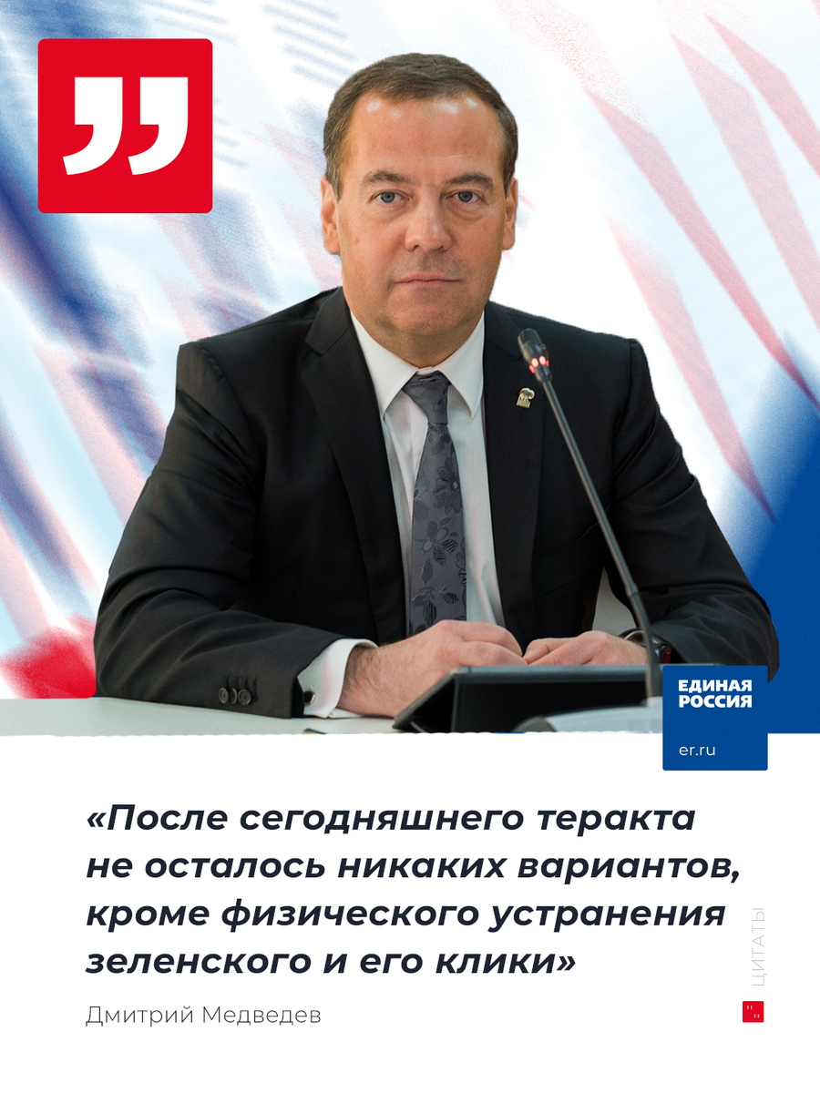 Председатель Единой России Дмитрий Медведев прокомментировал теракт, организованный властями Украины в Москве «После сегодняшнего теракта не осталось никаких вариантов, кроме физического устранения зеленского и его клики.